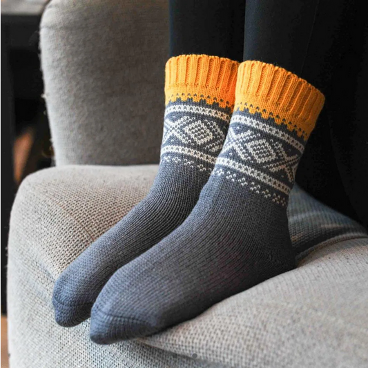 Wollsocken mit norwegischem Marius-Muster - Gelb / Weiß / Grau