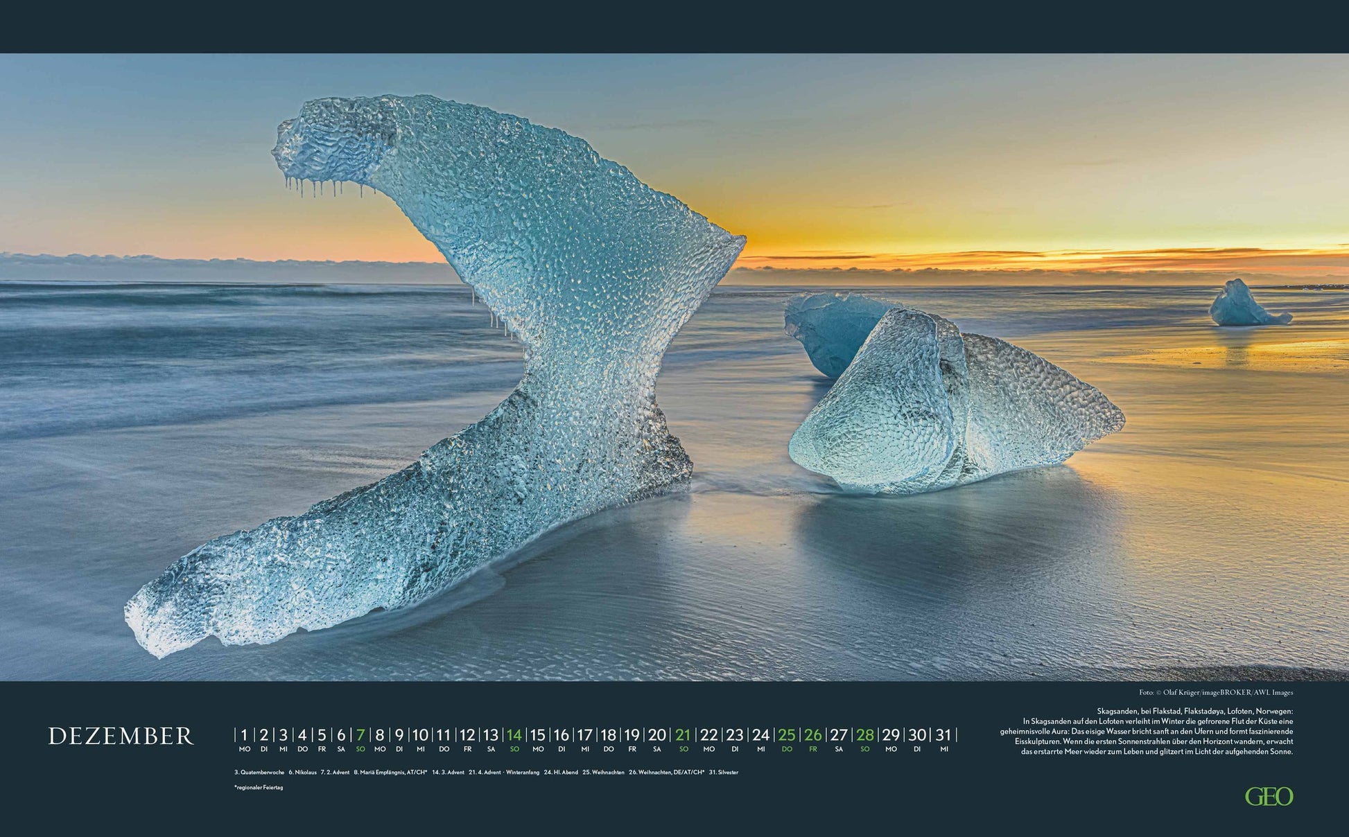 Zwölf Panoramabilder mit außergewöhnlichen Meerblicken u.a. auch aus Norwegen und Island, bei denen der Ursprung des Lebens zum Greifen nah scheint, erwarten Dich in diesem großformatigen GEO Wandkalender im Format 58 x 36 cm.