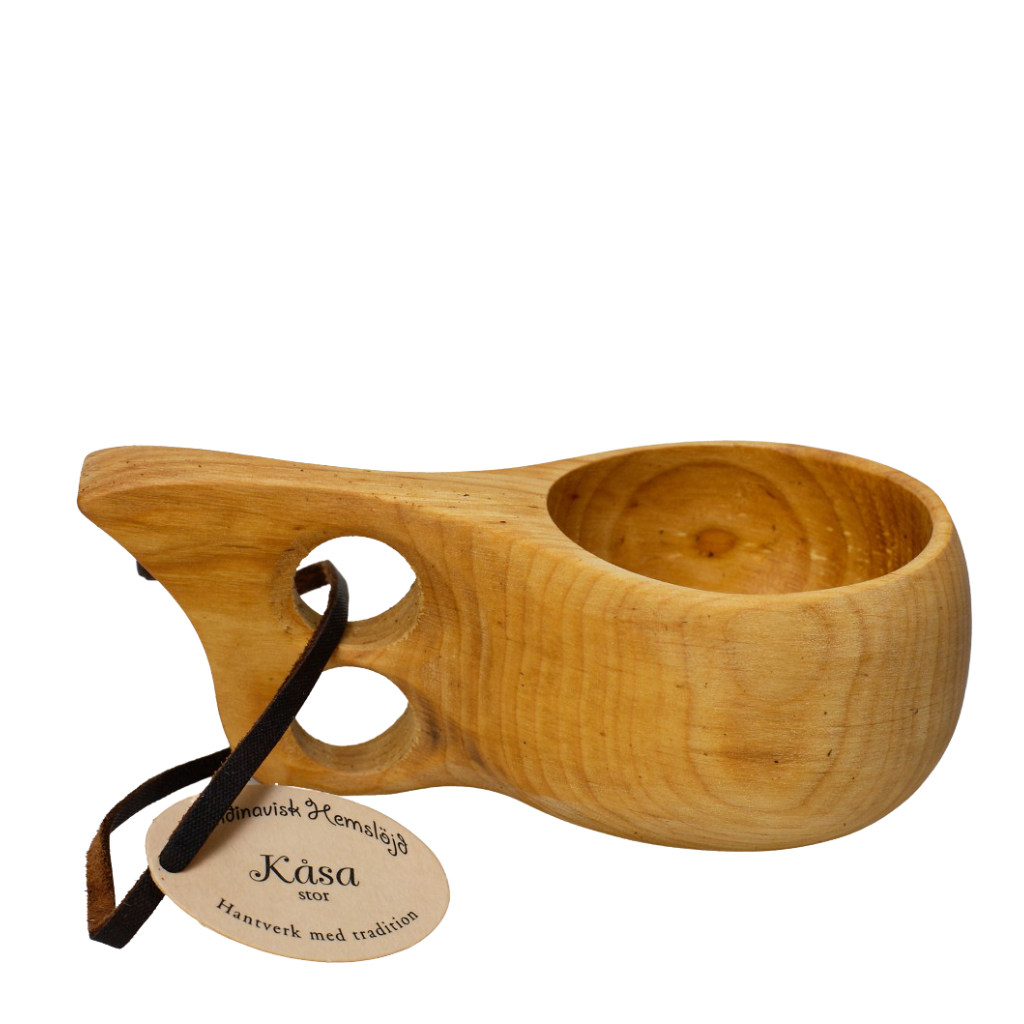Die Kåsa wird in einem kleinen traditionellen schwedischen Handwerksbetrieb aus Birkenknollenholz hergestellt. Sie wird geölt und mit einem Lederband versehen. Geeignet ist diese Tasse für kalte und warme Getränke. Die finnische Bezeichnung für dieses Trinkgefäß ist Kuksa.