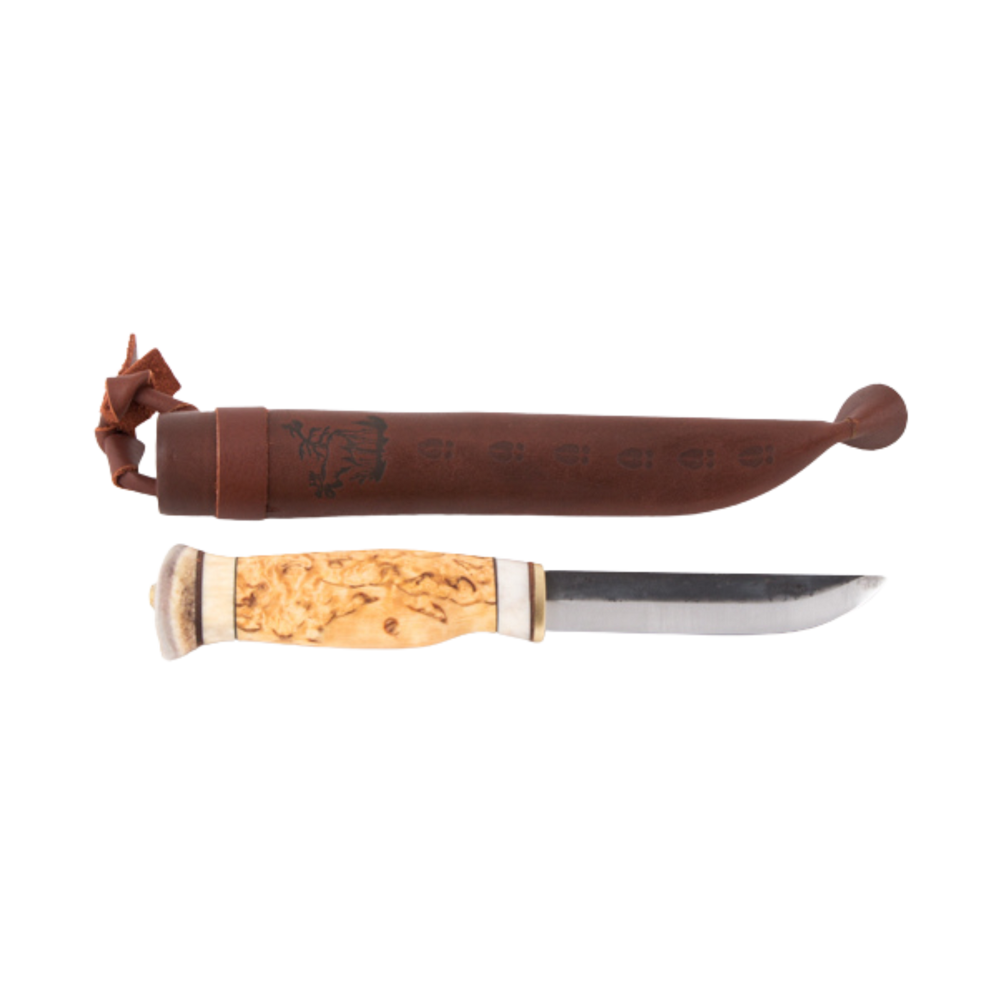 Kohlenstoffstahl-Klinge; Messergriffe aus Maserbirke und Rentierhorn und eine Lederscheide mit geprägtem Elchmotiv.