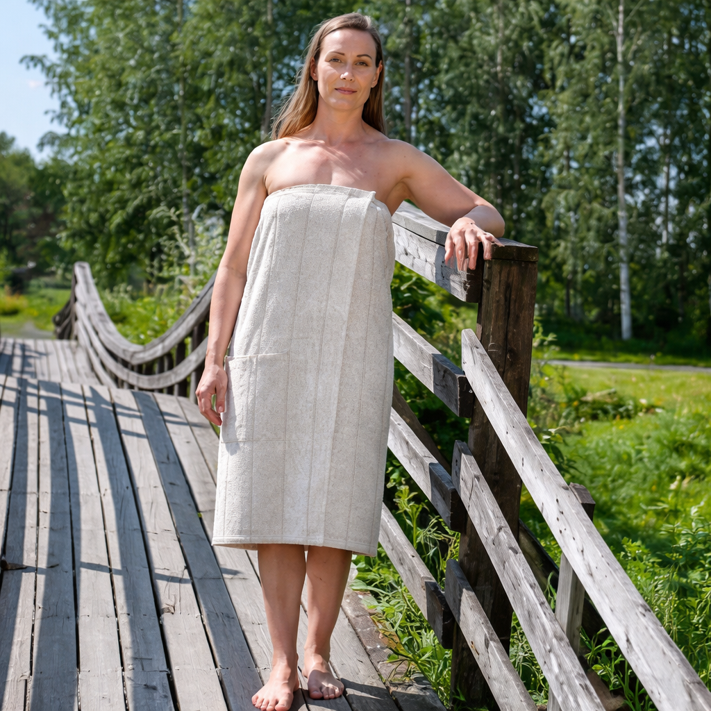Das Wickelhandtuch ist ideal zum Abkühlen und Abtrocknen nach Sauna oder Dusche. Es sitzt sicher durch den Klettverschluss und verrutscht nicht, sodass Du die Hände frei hast. Auf der Vorderseite verfügt es über eine große Tasche, zum Beispiel zum Verstauen Deines Handys.