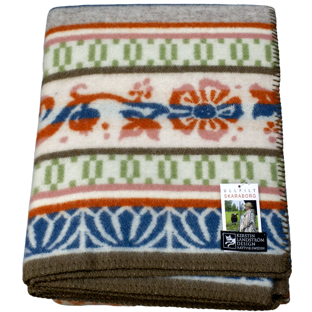 Die Decke ist in einer für Stoffe aus Västgötland typischen Farbkombination erhältlich: Beige, Braun, Blau, Rosa und Rostrot.